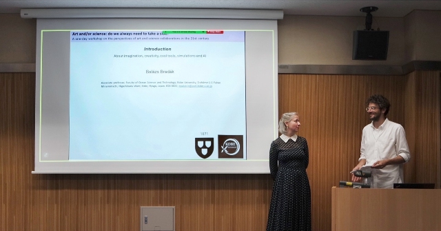 Szabó Klára Petra az MKE tanársegédje és Bradák Balázs egyetemi docens a 2025. július 7-én, a Kobe Egyetemen megrendezett Art and/or Science: Do We Always Need to Take a Side? workshopon.