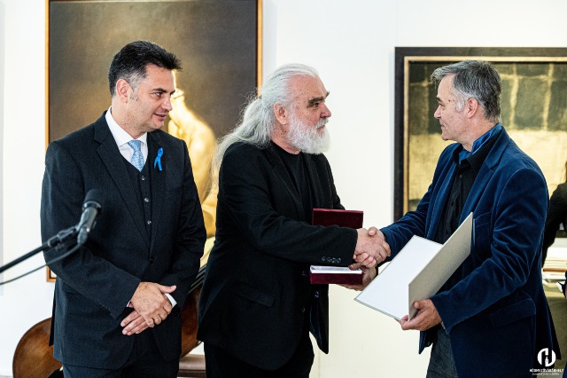 Dr. Nátyi Róbert (j), a Vásárhelyi Őszi Tárlat kurátora gratulál Szurcsik József (k) képzőművésznek, aki a 71. Vásárhelyi Őszi Tárlat fődíját, a Tornyai-plaketett vehette át a kiállítás megnyitóján 2025. október 5-én az Alföldi Galériában. A kép bal oldalán Dr. Márki-Zay Péter, Hódmezővásárhely Megyei Jogú Város polgármestere.