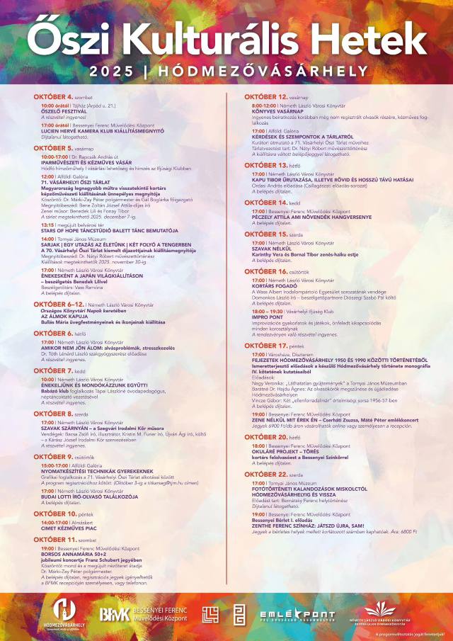 – Az Őszi Kulturális Hetek október 4-től október 22-ig tartanak [...] A programok között találnak az érdeklődők ingyenes rendezvényeket és olyanokat is, amelyekre belépőjegyet kell váltani. Úgy gondolom, hogy egy nagyon színes, széles körű ismereteket adó előadás- és programsorozatot sikerült összeállítanunk