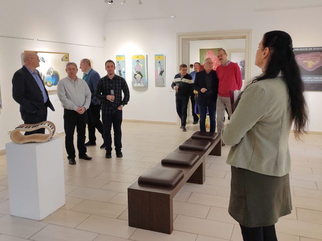 Selmeczi-Tóth Andrea múzeumpedagógustárlatvezetése a 71. Vásárhelyi Őszi Tárlaton a Rotary Club rendezvényén 2025 november 22-én, az Alföldi Galériában.