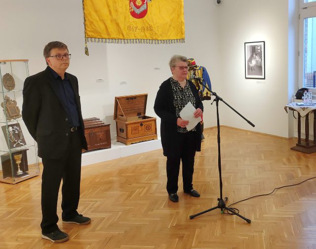 Berntásky Ferenc (j) helytörténész-muezológus és Nagy Vera (b) néprajzkutató-főmuzeológus, ny. múzeumigazgató az Igazgatók emlékezete – dr. Galyasi Miklós, a múzeum újjászervezője című kiállítás megnyitóján 2026. március 27-én, a Tornyai János Múzeumban.